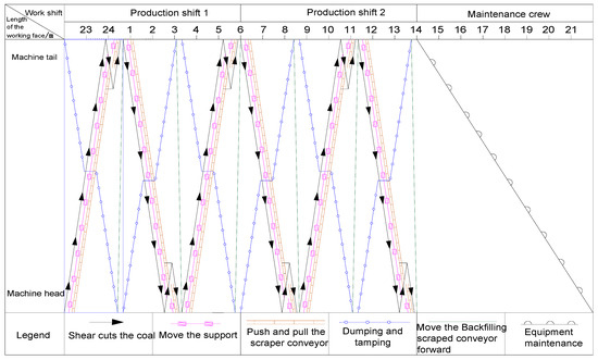 For the whole backfilling working face, the optimal operation implies achieving parallel, autonomous execution of the mining and filling processes through the shearer, scraper conveyor, hydraulic supports, and perforated bottom discharge scraper conveyor. For this purpose, one should ensure that the equipment and mechanisms executing different mining and filling processes do not interfere with each other and fulfill specified functions in a spatially and temporally organized manner. The spatial sequence refers to an appropriate spatial alternation of processes executed by different equipment at different frame positions in the working face. Temporal sequence refers to the chronological order of specific processes involving different mechanisms within a specific frame, which are organized temporally to complete the mining and backfilling operations. Based on the above principles, this study designed the cyclic parallel mining and backfilling operations in the fully mechanized mining face, as shown in Figure 6.