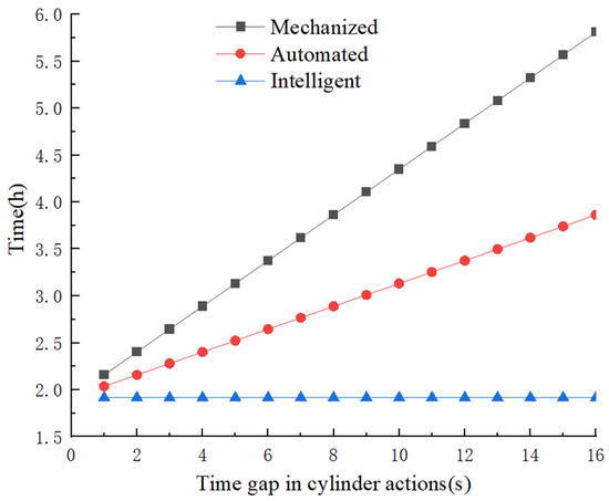 It can be seen in Figure 8 that for mechanized and automated solid backfilling operations, the time of cyclic operation is directly proportional to the time gap in cylinder actions. However, for intelligent operation, the time gap in cylinder actions approaches zero. When the time gap in cylinder actions is 5 s, the times of cyclic operation for mechanized, automated, and intelligent solid backfilling technologies are 3.13, 2.52, and 1.92 h, respectively. Compared with mechanized backfilling, the backfilling efficiency of automated and intelligent operations is improved by 19% and 39%, respectively.