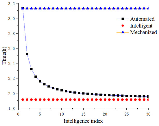 It can be deduced from Figure 11 that the time of cyclic operation in mechanized and intelligent solid backfilling technologies is irrelevant to the intelligence index. However, the time of cyclic operation in automated solid backfilling technology is inversely proportional to the intelligence index. At an intelligence index of 4, the times of cyclic operation for mechanized, automated, and intelligent solid backfilling technologies are 3.13, 2.22, and 1.92 h, respectively. Compared with mechanized filling, the backfilling efficiency of automated and intelligent operations is improved by 32% and 39%, respectively.