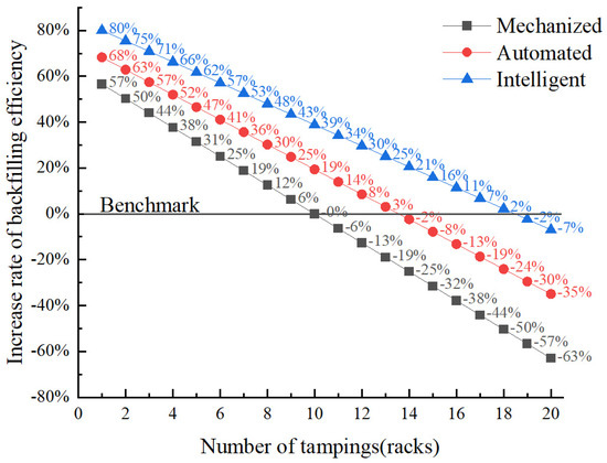 Compared with mechanized solid backfilling, the backfilling efficiency of the intelligent and automated solid backfilling technologies with ten tampings increased by 39% and 19%, respectively, while those with three tampings increased by 71% and 57%, respectively. As seen in Figure 10, when the number of tampings was reduced from ten to three, the backfilling efficiency of mechanized solid backfilling increased by 44%.