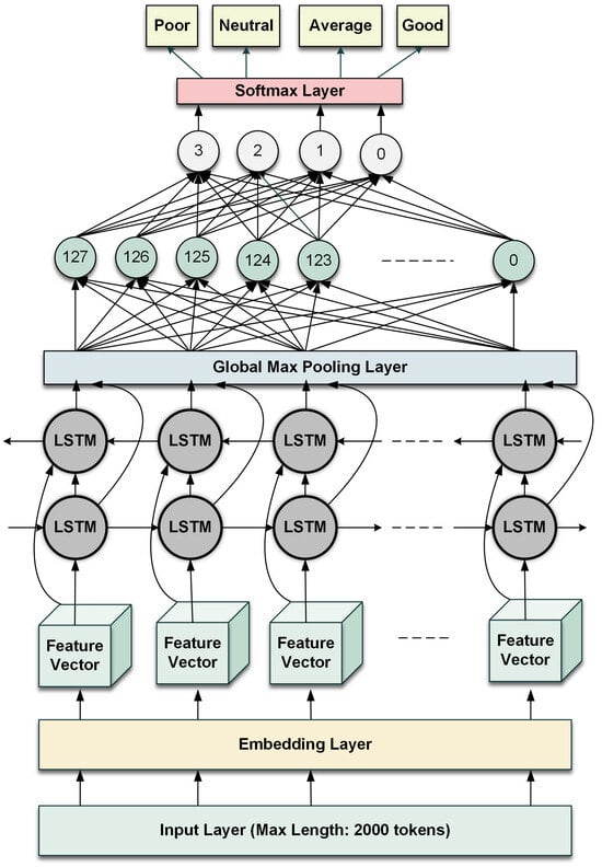 There is a BiLSTM network at the heart of the proposed DPMS. It is trained to analyze and to classify the sentiments of the stakeholders. The labeled dataset used in this paper has four classes, defined as . The network classifies the stakeholders’ feedback into one of these four classes. Based on this classification, a promotional management system is designed. The users are allowed to express their opinions without any word limitations. That is why the input to the network does not have a fixed length. The BiLSTM network is an ideal choice to work on inputs of variable lengths. Moreover, the user feedback are sequential data, where exploring both the forward and backward directions reveals valuable features for classifying the opinions accurately []. Considering these features and necessities, the BiLSTM network has been selected to design the proposed data-driven promotional management system.