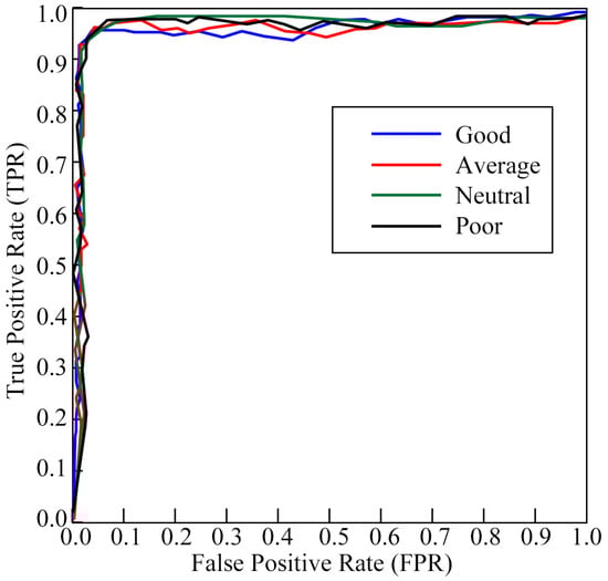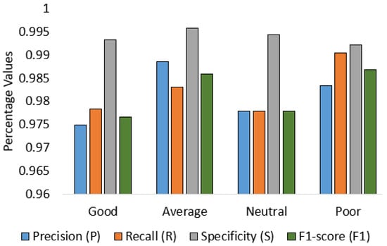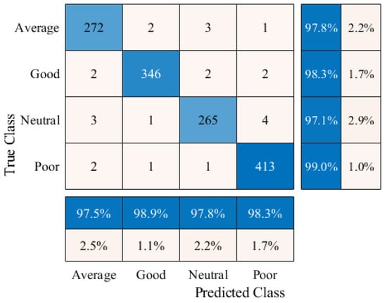 The analysis of the confusion matrix for the categories Good, Average, Neutral, and Poor reveals an impressively high-performing model, as indicated by a global accuracy of 98.66%. The values of different evaluation metrics are listed in Table 2. The individual class metrics further underscore this performance. The precision, which measures how many of the items are identified as belonging to a particular class actually do belong to that class, is highest for ‘Average’, at approximately 98.86%, followed closely by ‘Poor’, at 98.33%. ‘Good’ and ‘Neutral’ are also notably high, at approximately 97.49% and 97.79%, respectively. Recall, which assesses how many items of a particular class were correctly identified, is similarly high across all categories, peaking for ‘Poor’ at 99.04%. Specificity, indicating how well the model correctly identifies negative cases for each class, also maintains high rates—being above 99% for all classes. The F1-score, a balanced metric that considers both precision and recall, remains consistently high, ranging from approximately 97.66% for ‘Good’ to 98.68% for ‘Poor’. These statistics collectively signify a robust model that accurately distinguishes between the Good, Average, Neutral, and Poor classes.