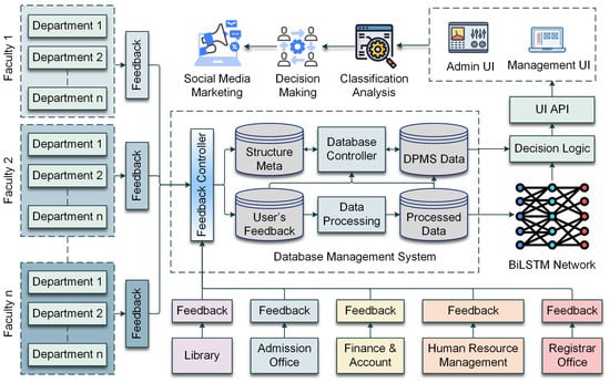 The major components illustrated in Figure 6 of the proposed DPMS systems are the university’s faculties, library, admission office, finance and account, human resource management, and registrar office. These divisions have been considered as individual nodes in the development phase. Each node is connected to its separate feedback, which has been created using Google Forms. Initially, the data are stored in multiple Google Sheets, each of which is uniquely identifiable by their nodes’ names. A module Feedback Controller has been designed to transfer the data from the Google Sheets to the MySQL database running in the VPS. The Feedback Controller stores the metadata in the Structure Meta table. The raw user’s feedback is stored in the User’s Feedback table. A processing module that follows the mathematical structure is explained in Section 3.1.2. The processed data are stored in the Processed Data table. The predictions from the BiLSTM network are stored in the DPMS Data table as historical data. The tables are accessed and controlled by the Database Controller that has been specially designed for the DPMS. A BiLSTM network receives the input from the Processed Data table and makes a prediction. The prediction is processed through the decision logic. There are a User Interface (UI) and Application Programming Interface (API) connected with the Admin UI and Management UI. According to the command from the Management UI, the classification is analyzed and the decision is made to promote a particular content on social media.
