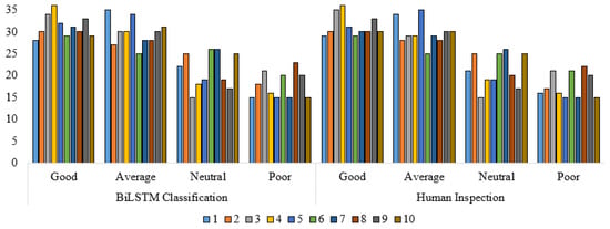 Table 4 compares human inspection and BiLSTM network classification across the ‘Good’, ‘Average’, ‘Neutral’, and ‘Poor’ categories, revealing a high degree of alignment between the two methods. Across ten attempts, the deviations are remarkably minimal, often within a one- to two-unit range, underscoring the model’s reliability. For instance, in categories like ‘Good’ and ‘Average’, the BiLSTM closely mirrors human assessments, diverging by, at most, one unit. The ‘Neutral’ and ‘Poor’ categories show similar minor variances. However, a noticeable discrepancy exists in the eighth attempt for the ‘Poor’ category, where the BiLSTM model categorizes one more than the human inspection. Despite this, the overarching consistency between the human and machine evaluations affirms the BiLSTM model’s robustness and high reliability. Its ability to mimic human-level categorization for various sentiments makes it an invaluable tool in sentiment analysis tasks. The comparison has been illustrated in Figure 7. The visual representation also supports the similarity between BiLSTM classification and human inspection.