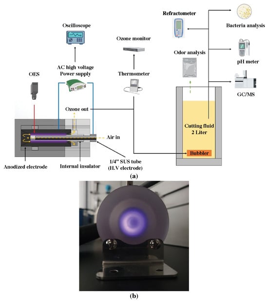 (a) Diagram of the compact air-cooled coaxial DBD reactor with bubbler configuration to disinfect water-based cutting fluids. (b) Image of compact air-cooled coaxial DBD plasma.