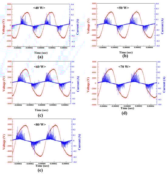 Voltage and current waveforms according to the applied power. Power consumption was calculated from the values of Vrms and Arms. (a) 40 W, (b) 50 W, (c) 60 W, (d) 70 W, (e) 80 W.