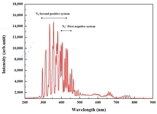 Optical emission spectrometry (OES) is an important technique used in plasma diagnostics. The distribution and internal states of various species within the plasma can be determined by observing the plasma-emitted light. Figure 1b shows the compact air-cooled coaxial DBD plasma generated at an applied power of 60 W and an air flow rate of 20 L min–1. A collimating lens was mounted under the emission hole of the compact air-cooled coaxial DBD. Emission analyses were performed at the center of the discharge gap. The excited nitrogen and oxygen species are expected to be measured in the air at the DBD [22]. Figure 3 shows the optical spectrum in the range 200–900 nm for the coaxial DBD plasma. The spectrum was found to be dominated by N2 (C3Πu − B3Πg) second positive system emissions at 300–450 nm as well as by N2+ (B2Σu − X2Σg) first negative system emissions 300–450 nm as a result of the direct or step-wise electron impact excitations and the pooling reaction of the nitrogen metastable state [23]. In addition, the OH band was not observed in the range 306–312 nm, along with the absence of lines associated with oxygen atoms in the air at the DBD. Ozone generated in a compact air-cooled coaxial DBD is formed via a three-body reaction of oxygen atoms [13,14,15,16], as shown below: