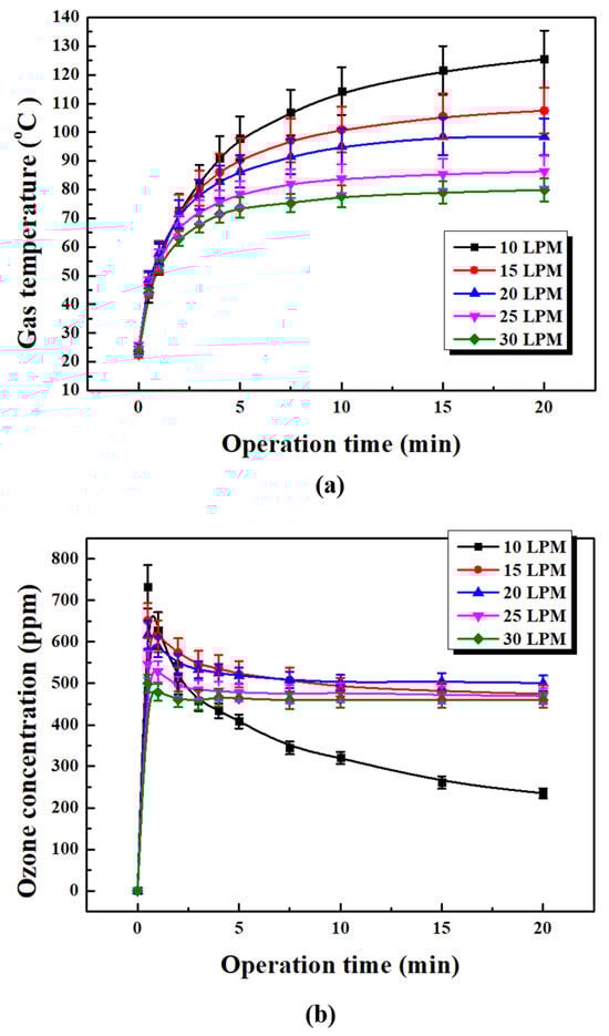 Time-dependent (a) concentration of ozone according to the applied flow rates measured by an ozone monitor and (b) outlet gas temperature measured by a thermometer. We carried out each measurement three times per given condition.