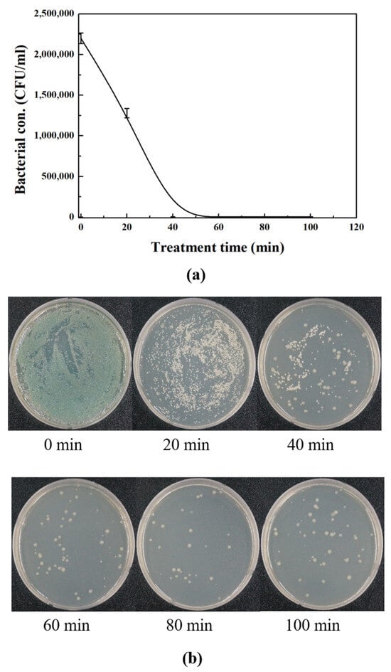 The experiment was conducted using a water-based cutting fluid for 6 to 12 months. The bacterial concentration after 48 h of incubation was 1.14 × 106 CFU/mL, and six morphologically different bacteria were isolated from the water-soluble cutting fluid (Figure 5). Six morphologically different bacteria were identified; a list of them is presented in Table 1 [26,27,28,29,30,31,32,33,34,35,36,37,38,39,40,41,42,43,44,45,46,47,48]. Among these, Achromobacter, Citrobacter, Pseudomonas, and Staphylococcus were the major genera identified in the water-soluble cutting fluid. Among the isolated bacteria, Achromobacter xylosoxidans has been isolated from hospitals, homes, and water, has been reported to produce foul odors, and is infectious to humans [26,27,28,29,30], whereas Citrobacter farmeri has been reported to cause illness in humans and is also known to produce foul odors [31,32,33]. Strains of Pseudomonas chengduensis have been found in humans (disease), animals, waste cooking oil, and landfills and have been reported as odor-causing bacteria, similar to other bacteria. However, unlike other bacteria, P. chengduensis has not been reported in human disease cases [34,35,36,37,38,39,40,41,42,43,44]. The last isolate, Staphylococcus warneri, has been found in the environment and animals and has been reported as an odor-causing bacterium in disease reports [45,46,47,48]. Figure 6a shows the bacterial sterilization of the cutting fluid samples using the ozone treatment. It can be seen that the plasma-generated ozone treatment sharply reduced microbial growth by 40 min, and more than 99% were killed after 60 min of treatment. Figure 6b shows the morphology of the cultured bacteria as a function of the ozonation time, with small differences between 40 and 100 min. The bacteria tested in Figure 6 are a mixture of the six types.
