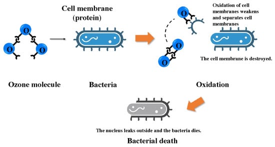 Figure 7 shows a schematic of the process of bacterial death upon treatment with ozone. Ozone binds to bacterial cell membranes composed of proteins, and an oxidation process occurs. In this process, one molecule of oxygen weakens cell membrane protein binding and destroys the bacterial cell membrane so that organs related to growth and proliferation inside the cell are eluted and the bacteria die [49,50].