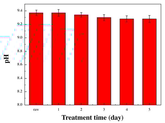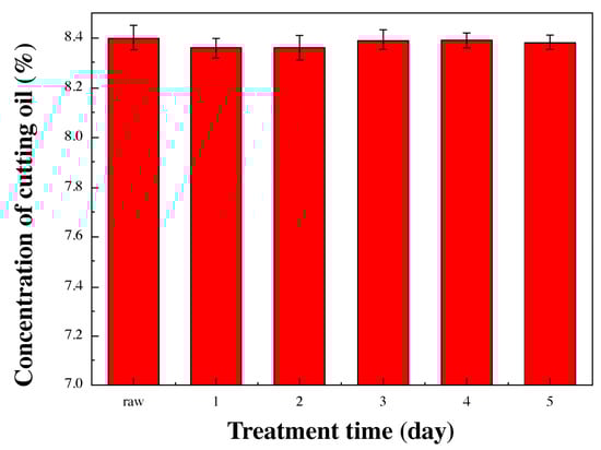 It is important to observe the concentration change of oil in the cutting fluid because it influences the machining performance. In this context, Figure 8 shows the oil concentration of the cutting fluid based on the ozone treatment time. The initial concentration of fresh cutting oil was approximately 8.4%. We treated it for 10 min with an interval of 1 h over 1 d, and the treatment was repeated for 5 d, showing that their concentrations were 8.36%, 8.36%, 8.40, 8.40, and 8.40%, respectively, with insignificant concentration changes. The pH of the cutting fluid is shown in Figure 9, where those concentrations have been compared with the initial pH value of 9.37. The concentration of cutting oil and the pH of the cutting fluids remained almost unchanged after the ozone treatment.