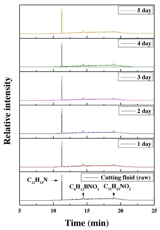 Figure 10 shows the changes in the chemical composition of fresh-water-based cutting fluids due to ozone treatment. The compositional changes in the fresh cutting fluid due to the ozone treatment were analyzed by a qualitative GC/MS analysis, and one intense peak and two additional peaks were observed at retention times of 11.24, 14.42, and 18.93 min, respectively. The molecular species identified were C12H23N, C6H12BNO3, and C12H23NO2. We confirmed that the shifts and intensities of the peaks remained almost unchanged. Consequently, the concentration of ozone generated from the compact air-cooled coaxial DBD was not sufficiently high to dissociate the molecules. The complex odor and discoloration of water-based cutting fluids occur owing to the growth of microorganisms and putrefying bacteria, which significantly reduce cutting performance, prevent rust, and deteriorate the working environment. Figure 11a shows the improvement in chromaticity of the waste cutting fluids after ozone treatment for 12 h. It can be confirmed with the naked eye that the color of the waste cutting fluids becomes brighter after plasma treatment. The chromaticity of the recovered waste cutting fluids was close to that of the fresh cutting fluids after the plasma treatment. The chromaticity was observed to improve with the removal of dissolved impurities from the waste cutting fluids after the ozone treatment. In addition, Figure 11b shows the complex odor measured from the waste cutting fluids according to the ozone treatment. The initial odor of the waste cutting fluids was strong owing to the growth of impurities and microorganisms. The complex odor concentration of the waste cutting fluid, measured using an odor meter, was 450 OU. A higher concentration of complex odors indicates a stronger odor. The complex odor decreased by approximately 80% after 24 h of exposure to the ozone generated in the plasma. The four genera contained in waste-cutting fluids produce a complex odor. In this system, it was proved that about 99.99% of the bacteria were sterilized after the ozone treatment. The complex odor of the fresh cutting fluid was measured to be approximately 100 OU because of the oil contained in the cutting fluid. However, the complex odor of the waste cutting fluids that were treated with plasma for 24 h was approximately 25 OU, and that for 10 h was 120 OU. Therefore, it is necessary to maintain the concentration of oil-containing cutting fluids and an appropriate ozone treatment time. Consequently, the complex odor reduction in waste cutting fluids was improved by sterilization.