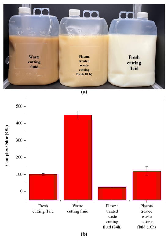 (a) The chromaticity of waste cutting fluids was recovered close to that of fresh cutting fluids after plasma treatment. (b) The odor was measured from waste cutting fluids according to the ozone treatment (n = 5).