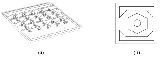 A traditional cross-strip anode consists of two layers: one for the X dimension and one for the Y dimension. The geometry designed in this article uses a single layer of strip XS anode with the strip array located on the front side of a thin PCB. The anode is divided into transverse electrodes and longitudinal electrodes, which are used for the position encoding of two sets of events. The anode converts the received electrons into charges, which are transmitted to 32 horizontal strips and 32 vertical strips, respectively. The model diagram of the XS anode is shown in Figure 3a. And, Figure 3b is the smallest unit of the designed single anode shape, which is composed of horizontal strips and 32 vertical strips. The horizontal electrodes are strip-shaped and the shape of the vertical electrode is a hexagonal pad, and the horizontal and vertical receiving areas are 1:1 to ensure that the signal pickup amplitude on each layer is almost equal. This is designed to improve the ability to resolve “multiple hit” events. For pulsed sources or high-rate operation, it is beneficial to increase the count rate.
