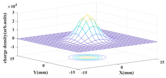 The dynamic characteristics of the surface charge density of the XS anode were studied, as shown in Figure 4. The electron cloud follows a Gaussian distribution on the anode, and the electrons are collected by horizontal strips and vertical strips. The diffusion radius of the electron cloud increases with the distance d. On the one hand, a charge cloud that is too narrow can cause image distortion. On the other hand, excessive diffusion of charge cloud footprints can lead to distortion at the edges of the image, resulting in a reduction in the signal-to-noise ratio and thus in resolution. The number of strips we want to cover is 3–5, so we want the distance between the MCP and the anode to be as small as possible, but the actual distance also needs to be considered. So, we chose the distance of d to be 0.5–2 mm.