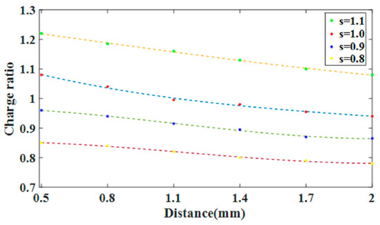 The relationship between the collected charge of the horizontal and vertical strips and the receiving area is shown in Figure 5. At different emission distances d, by changing the width and distance of the horizontal strips and the vertical strips, different proportions of receiving areas are obtained. Obviously, the charge ratio decreases with the increase in d, increases with the increase in the receiving area, and the rate increases. It can be seen that the singlelayer XS anode designed in this paper has a high charge collection efficiency. When the receiving area ratio s of the horizontal and vertical strips is 1, d is 2 mm and the charge ratio approaches 1. Furthermore, inaccuracies in charge collection can affect image distortion during imaging. That is, each of the horizontal and vertical electrodes receive half of the charge from mcp. This means more charge from the MCP charge footprint will be collected by the anode and less charge can be lost.