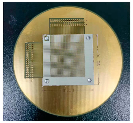 Figure 8 shows the actual picture of the XS anode produced. The XS anode bases are all rogers (εr = 2.2). The XS anode is designed and manufactured from the PCB process. The traditional upper and lower strips are processed on the same plane, divided into horizontal strips and vertical strips, which can avoid the upper stripe from blocking the lower strip which can be made into large area array detectors. At the same time, it can also avoid the upper electrode from blocking the lower electrode, improve charge collection efficiency, and improve SNR. The specific parameters of the strip production are shown in Table 1.