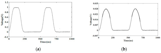 Then, the crosstalk is tested. We study induced pulses at adjacent strips when signals within the event pulse time range are transmitted through one strip. The ground plane is used to eliminate noise signals including space radiation interference, and the high-impedance probe is used to reduce the influence of the test equipment on the parasitic parameters of the device under test. Then, a periodic pulse signal is output through the Tektronix 3011 signal generator. The pulse rise time is 10 ns and the pulse amplitude is 1 V. Finally, the Agilent 5032 A wave detector is used to display the transmission signal on the interfering line and the crosstalk signal on the interfered line and compare the impact level of crosstalk under different conditions (see Figure 9a). It can be seen from the test results in Figure 9 that the crosstalk on adjacent lines is very obvious; the peak-peak value of the induced signal of the far-end adjacent strip reaches 28 mv. The crosstalk signal has a smaller pulse amplitude than the main signal. Therefore, we conclude that appropriate selection of parameters will reduce crosstalk.