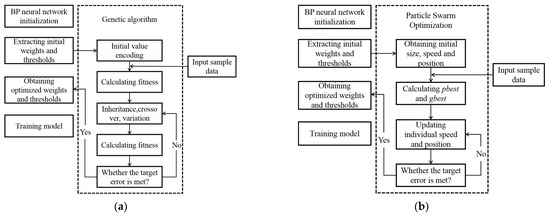 Flow charts of the GA- and PSO-optimized BP neural networks [20]: (a) GA-BP neural network model and (b) PSO-BP neural network model.