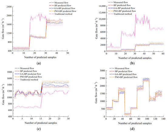 Flow prediction results of traditional water measurement methods, the BP model, the GA-BP model, and the PSO-BP model under different flow patterns: (a) free outflow with gate control; (b) submerged outflow with gate control; (c) weir flow; and (d) combined flow patterns.
