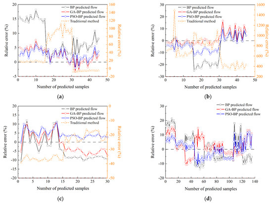 Relative errors of traditional water measurement methods, the BP model, the GA-BP model, and the PSO-BP model under different flow patterns: (a) free outflow with gate control; (b) submerged outflow with gate control; (c) weir flow; and (d) combined flow patterns.