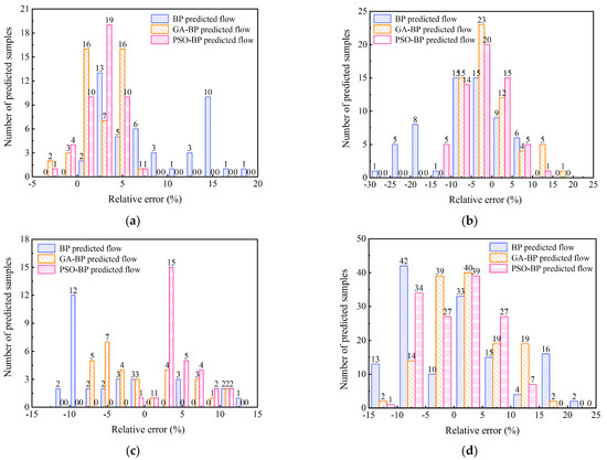 To further understand the error distributions of the three models under different flow patterns, the error distribution statistics of the three models are given in Figure 7. Under conditions of free outflow with gate control and submerged outflow with gate control, the error distributions of the GA-BP and PSO-BP models are characterized by an approximately normal distribution, while the BP model has more outliers with relative errors of 15% and above. Under the weir flow condition, the BP model has 14 samples distributed at 10% and above. The GA-BP and PSO-BP models do not have outliers with large relative errors, but the PSO-BP model has a more concentrated distribution of errors. In the case of a combination of the three flow patterns, when the relative error is within −10~10%, the number of samples predicted by the GA-BP and PSO-BP models is significantly greater than that of the BP model. The BP model has more outliers with relative errors of 15% and above. In summary, the GA algorithm and PSO algorithm improve the error distribution of the BP model, narrow the error distribution range of the BP model, and stabilize more samples within an acceptable range. The PSO algorithm has a better optimization effect on the error distribution of the BP model than the GA algorithm, making the error distribution more concentrated.