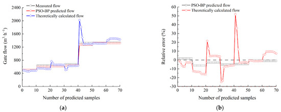 To verify the calibration effect of the neural network model on the layer velocity of the measurement box of the integrated measurement and control gate, the flow measurement device was used to conduct gate flow measurement tests again under seven working conditions. The variation range of flow is 400~1500 m3/h, and the variation range of gate opening change is 100~400 mm. The 10 sets of data were continuously obtained for each working condition, and a total of 70 sets of data were obtained as prediction samples. The flow of the measurement box was predicted using a trained PSO-BP neural network model. The PSO-BP model predicted the flow, the theoretically calculated flow from the flow velocity of each layer in the measurement box, and the measured flow were compared, and their relative errors with the measured flow rate were calculated, as shown in Figure 8. There are a total of 10 layers of flow velocity inside the measurement box. Based on the size of the measurement box, the flow calculation formula inside the measurement box can be described as:
