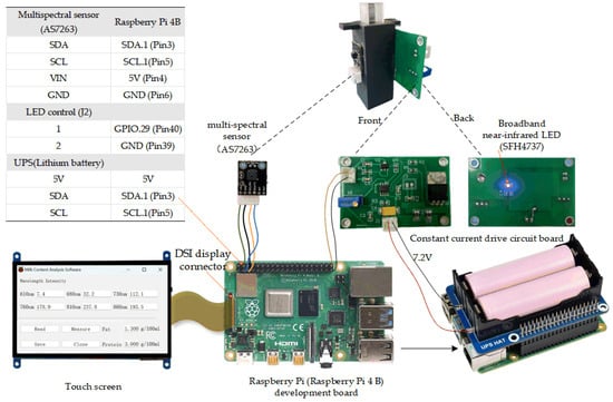 Figure 1 shows the overall architecture of the portable instrument for milk detection based on a multi-spectral sensor. The instrument consists primarily of hardware and software. The hardware includes a Raspberry Pi (Raspberry Pi 4 B) (Shenzhen, China) development board, touch screen, lithium power module, cuvette, multi-spectral sensor, and broadband NIR LED controlled by a constant-current driver circuit. PyQt5 (Version 5.15) and Python codes (Version 3.7) were used to develop the software interface and implement the required functions to train the model to detect the main components of milk. Integration of the hardware and software components resulted in a portable instrument for milk composition measurements.
