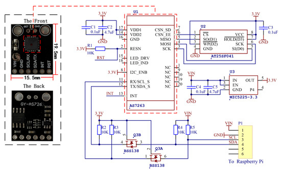 Figure 2 shows the operating principle of the AS7263 circuit. U1 is the AS7263 multi-spectral sensor. U2 is a flash memory chip that stores the firmware of multi-spectral sensors. U3 is a low-dropout voltage regulator chip that converts the 5 V voltage from the Raspberry Pi module to the 3.3 V required for the stable operation of the sensor. AS7263 is a 6-channel spectral sensor that is used for spectral assessment employing NIR light. It consists of six independent optical filters with spectral responses that are defined in the NIR wavelength from approximately 600 nm to 870 nm, with a full width at half maximum of 20 nm. It is highly accurate, stable, and independent of the time of use and temperature.