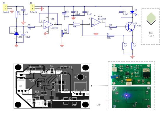 The constant-current driver circuit of the light source is shown in Figure 3. J1 is used to connect lithium batteries and directly provide a working voltage of 7.2 V for the constant-current driver circuit, and J2 achieves the LED control. D1 is a broadband NIR LED. Potentiometer W1 is used to adjust the current level of D1. The Raspberry Pi’s GPIO pin 29 is set to a high value for each measurement. Using J2, the voltage regulator TL431 outputs a 2.5 V reference voltage. After 5 s of D1 conduction, the GPIO pin outputs a low-level voltage, and D1 turns off. For each conduction time of 5 s, the LED heat generation is small, which improves the service life of the LED and reduces power consumption by using only the copper foil on the back of the PCB to dissipate heat.