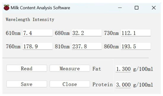 Figure 4 shows the milk analysis software (Version 1.2) used in this study. The software was written using Python and pyqt5 code. The Read button reads the wavelength of the milk sample, the Measure button predicts the fat and protein content, the Save button saves this measurement and the predicted information, and the Close button exits the milk composition analysis software.