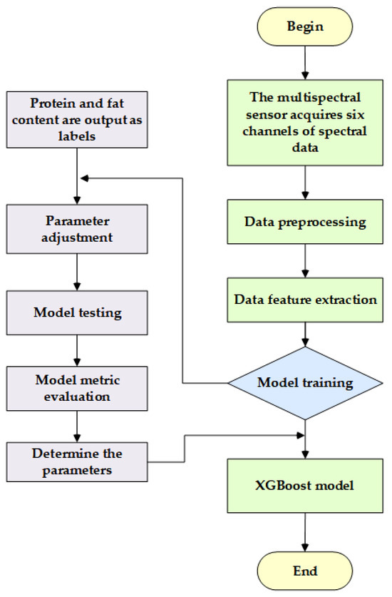 A complex nonlinear relationship exists between milk composition and the corresponding spectral data, and the model trained using the XGBoost machine learning algorithm can fit this nonlinear relationship flexibly and facilitate accurate predictions. The XGBoost algorithm [28] is a gradient-boosting-based machine learning algorithm that builds a stronger model by integrating several weak models to solve predictive regression problems. It has several advantages compared to other machine learning models, including high prediction accuracy, high speed, and good generalization ability.