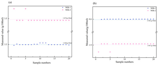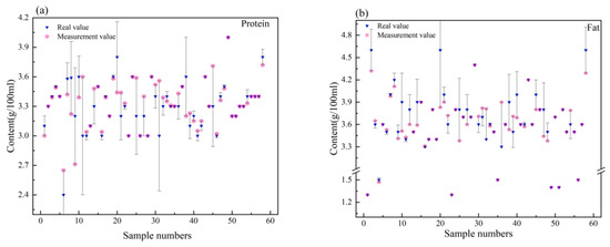 Milk is an important dairy product that is widely used in the food and nutrition industry, and accurately determining its contents is important in ensuring food quality and safety. Protein and fat are important components of milk, and protein plays a crucial role in the growth and development of the human body as well as the immune system [1,2]. Fat is a high-energy nutrient [3]. Therefore, in the process of milk procurement and production management, it is necessary to detect the contents of the main components of milk accurately and quickly, as this can not only provide a reference basis for milk quality analysis and production process quality control, but also provide scientific guidance for the excellent rearing of cows [4].