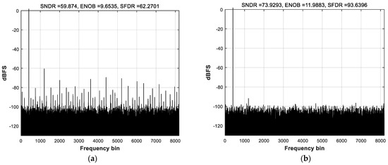 Simulated dynamic performances of a 12-bit pipeline ADC: (a) Before calibration. (b) After calibration.