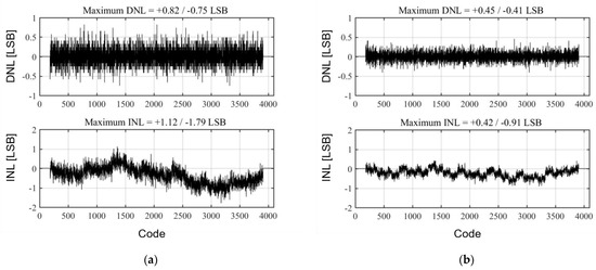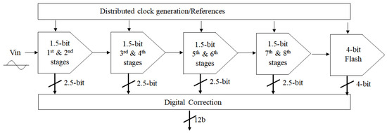 The pipeline analog-to-digital converter ADC architecture is the most suitable for high-speed operations with medium-to-high resolution among various ADC architectures. However, because the analog-to-digital conversion of the pipeline ADC is performed in the analog domain, various errors generated from analog circuits, such as charge injection, finite gain error of an operational amplifier (op-amp), and capacitor mismatch error, must be suppressed to achieve high resolution. Most errors, except capacitor mismatch error, can be addressed owing to advances in circuit techniques and CMOS technologies [1,2,3,4,5]. However, capacitor mismatch significantly depends on the CMOS technology and requires special calibration circuitry to minimize the linearity degradation of the ADC output.