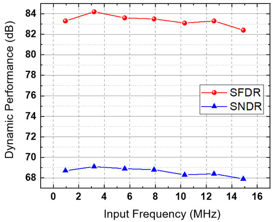 The measured static performances of the ADC before and after calibration are shown in Figure 11. Before the calibration, the measured DNL and INL were less than +0.82/−0.75 and +1.12/−1.79 LSB, respectively. After calibration, the DNL and INL improved to +0.45/−0.41 and +0.47/−0.91 LSB, respectively. The measured power spectra for input frequencies of 2.09 MHz and 14.1 MHz are also shown in Figure 12, respectively. At an input frequency of 2.09 MHz, the measured SNDR and SFDR improved from 63.9 dB and 69.3 dB to 68.9 dB and 84.1 dB, respectively, and the resulting ENOB, calculated as (SNDR−1.76)/6.02, was 11.1 bit after calibration. After calibration, the measured dynamic performances versus the input frequency are shown in Figure 13. The measured SNDR and SFDR varied from 67.9 to 69.1 dB, 82.4 to 84.2 dB, respectively, for input frequencies up to the Nyquist frequency. The total ADC power consumption was 35 mW, including the reference generation and all peripheral circuits. The FOM, which is calculated as power/(2ENOB·sampling frequency), was 512 fJ/conversion. The ADC performance is summarized in Table 1.
