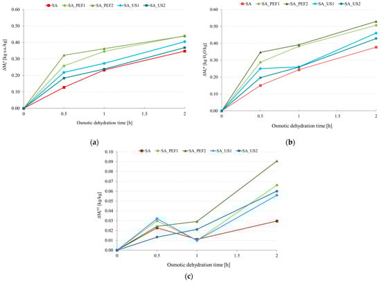Water loss increased with the duration of the osmotic dehydration process in all analyzed materials. At the end of the osmotic dehydration process (after 2 h), it was found that the highest water loss occurred in the material subjected to osmotic dehydration using a PEF pretreatment of 2.5 kJ/kg. Regardless of the pretreatment used, the highest water losses were recorded in the initial stage of osmotic dehydration. As the osmotic dehydration process continued, the rate of water loss gradually diminished. After the initial stage, in which the diffusion process is rapid, the rate of change of water loss decreases [52]. Therefore, Nowacka et al. [53] found that the use of ultrasound for 10 min is useful for water removal only for short osmotic dehydration processes (120 min, 25 °C, 61.5% sucrose solution). In turn, Goula et al. [54] performed an osmotic dehydration on potatoes (30–70% of osmotic solution concentration, 32.5–45 °C, 0–180 min) and showed that the application of ultrasound (5 min of US treatment, 32.5 °C, 40% of amplitude level, 7/6 pulse duration/pulse interval ratio) increased in the first 60 min of water loss, and that the solid gain obtained the same or even better osmotic effect as the normal osmotic dehydration over a long time (180 min). Their study showed that ultrasound-assisted osmotic dehydration lasting a short time (~60 min) had the same effect as longer osmotic dehydration without an ultrasound application, and the difference in water loss between treatments was most intense during the first hour.