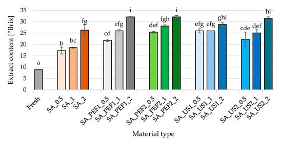 Extract content in strawberries subjected to US and PEF treatments and osmotic dehydration in 50% sucrose solution at 30 °C; SA: osmotic dehydrated strawberries in 50% sucrose solution; SA_PEF1 and SA_PEF2: pulsed electric field-treated strawberries with the energy of 1 or 2.5 kJ/kg and subjected to osmotic dehydration; SA_US1 and SA_US2: ultrasound-treated strawberries for 30 and 90 s and subjected to osmotic dehydration. The same letters above the columns present homogenous groups at α = 0.05.