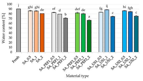 The water content of strawberries subjected to US and PEF treatments and osmotic dehydration in 50% sucrose solution at 30 °C; SA: osmotic dehydrated strawberries in 50% sucrose solution; SA_PEF1 and SA_PEF2: pulsed electric field-treated strawberries with the energy of 1 or 2.5 kJ/kg and subjected to osmotic dehydration; SA_US1 and SA_US2: ultrasound-treated strawberries for 30 and 90 s and subjected to osmotic dehydration. The same letters above the columns present homogenous groups at α = 0.05.