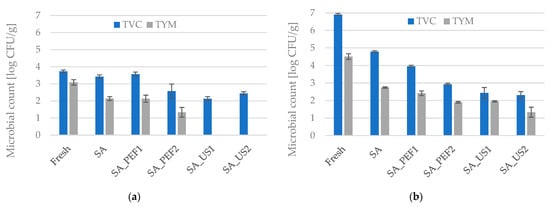 Total viable count (TVC) and total count of yeast and mold (TYM) in strawberries subjected to US and PEF treatments and osmotic dehydration in 50% sucrose solution at 30 °C (a) after the treatment; (b) after 7 days of storage in temperature of 10 °C; SA: osmotic dehydrated strawberries in 50% sucrose solution; SA_PEF1 and SA_PEF2: pulsed electric field-treated strawberries with the energy of 1 or 2.5 kJ/kg and subjected to osmotic dehydration; SA_US1 and SA_US2: ultrasound-treated strawberries for 30 and 90 s and subjected to osmotic dehydration.