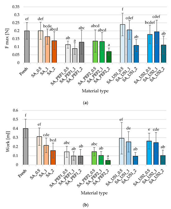 Maximum force (a) and work (b) necessary to deform strawberries subjected to US and PEF treatments and osmotic dehydration in 50% sucrose solution at 30 °C; SA: osmotic dehydrated strawberries in 50% sucrose solution; SA_PEF1 and SA_PEF2: pulsed electric field-treated strawberries with the energy of 1 or 2.5 kJ/kg and subjected to osmotic dehydration; SA_US1 and SA_US2: ultrasound-treated strawberries for 30 and 90 s and subjected to osmotic dehydration. The same letters above the columns present homogenous groups at α = 0.05.