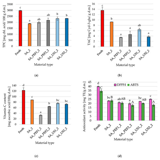 During osmotic dehydration, the material is immersed in a specific osmotic solution. Depending on the purposed quality of the final product, it can be, e.g., starch, sucrose, glucose, fructose or corn syrup. The way in which this process is carried out permits the transfer of certain substances from the material to the osmotic solution, as well as in the reverse direction [67]. Figure 6 displays the total polyphenols content (TPC), the total anthocyanin content (TAC), the vitamin C content, and the antioxidant activity of fresh and osmotically dehydrated strawberries (untreated and treated with US or PEF). Fresh strawberries had the highest content of bioactive compounds—2981.0 ± 34.0 mg chl. acid/100 g d.m. (TPC), 13.6 ± 1.2 mg Cyd-3-glu/g d.m. (TAC), 122.7 ± 9.4 mg ascorbic acid/100 g d.m. (vitamin C), 39.9 ± 1.6 mg TE/g d.m. (DPPH), and 34.5 ± 1.6 mg TE/g d.m. (ABTS). Osmotic dehydration has led to a reduction in the amount of these compounds in strawberries by 36.5, 31.7, 28.0, 42.2, and 31.9%, respectively (untreated samples—SA_2). The root cause of this observation can be found in the way the process was carried out. Not only water but also some of the bioactive ingredients dissolved in it could have penetrated the solution surrounding the material [67,68].
