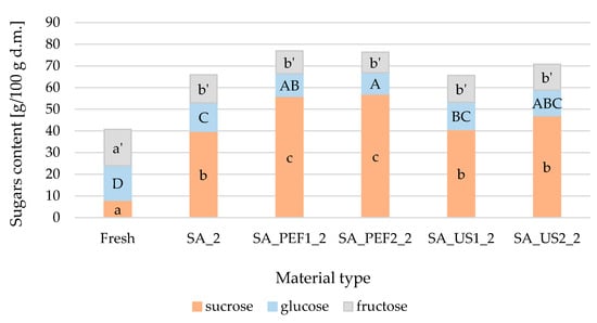 During osmotic dehydration, immersing the material in a hypertonic solution leads to the simultaneous movement of water from the material into the osmotic solution and the infusion of osmotic solutes in the reverse direction, from the osmotic solution into the material [45]. Figure 7 presents the content of sugars (sucrose, glucose, and fructose) in fresh and osmotically dehydrated strawberries (untreated and treated with US or PEF). Fresh strawberries contained 8.1 ± 0.6 g sucrose in 100 g d.m., 15.8 ± 0.7 g glucose in 100 g d.m., and 16.8 ± 1.6 g fructose in 100 g d.m. Osmotic dehydration led to an increase in the sucrose content in strawberries by 394.1%, as well as a reduction in their glucose and fructose contents by 16.5 and 23.2%, respectively (untreated samples—SA_2). All three of the above-mentioned sugars are soluble sugars that naturally occur in strawberries [74]. Dehydration of these types of fruit in a sucrose solution resulted in a leakage of some of the glucose and fructose, while enriching them with the sucrose in which they were immersed [75]. The sucrose content in the untreated and in the US-pretreated osmotically dehydrated strawberries was similar. In turn, the PEF-pretreated and osmo-dehydrated samples had a significantly higher content of this sugar than the untreated osmo-dehydrated ones. The samples treated with US also had a similar glucose content to the untreated samples, while those samples treated with a PEF had the lowest content of this sugar. Although no statistically significant differences were observed in the fructose content among all dehydrated strawberries, a slightly lower concentration of this sugar was noted in the samples that underwent the PEF treatment. The highest changes in terms of sugar content in the PEF-pretreated and osmotically dehydrated strawberries could be caused by electroporation, which results in increased tissue permeability [76]. This led to the highest water loss (perhaps together with the glucose and fructose dissolved in it) (Figure 1b) and the highest solid gain (after sucrose penetration from the solution) of these samples (Figure 1c). As explained Zongo et al. [77] water removal and sugar gain in the case of mango subjected to the PEF treatment (1 kV/cm, 10 and 30 pulse numbers) and to osmotic dehydration (4 h, 40 °C, 60 °Brix agave syrup with or without addition of inulin or xantan gum) depends on the plant tissue microstructure and its changes during the processing.