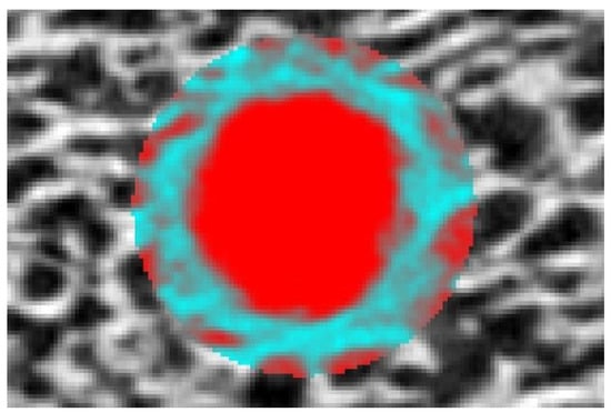 A cylindrical mask with a diameter of 4.5 mm (50% larger than the osteotomy diameter) was used to determine the volume of interest for mathematical analysis. The mask was colored red.