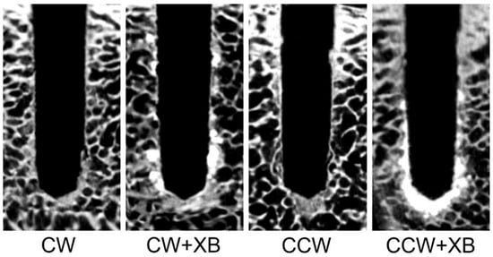 The different osteotomy approaches produced different density aspects (Figure 3). The use of XB produced stronger densification at the body and apex of the implantation site regardless of drilling direction, with improvement in bone volume and trabecular thickness and a reduction in trabecular separation inside the VOI (Table 2). The CW + XB group produced the same level of porosity as CCW. CCW + XB reduced the lowest percentual porosity inside the VOI (p < 0.05).