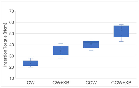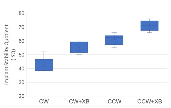 Unusually, the evaluations indicated marginal differences between the CW + XB and CCW groups, establishing no significant divergence (p > 0.05). Conversely, the CCW + XB cohort emerged as the group presenting the zenith in both IT and ISQ values, a statistically significant observation (p < 0.05).
