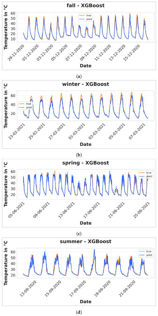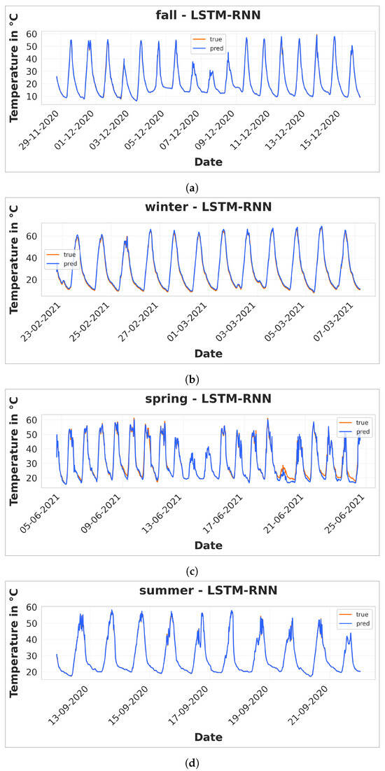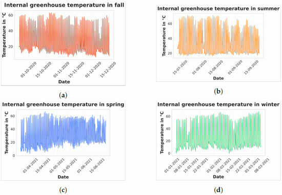 Dataset corresponding to greenhouse internal temperature. Data for fall (a), summer (b), spring (c), and winter (d).