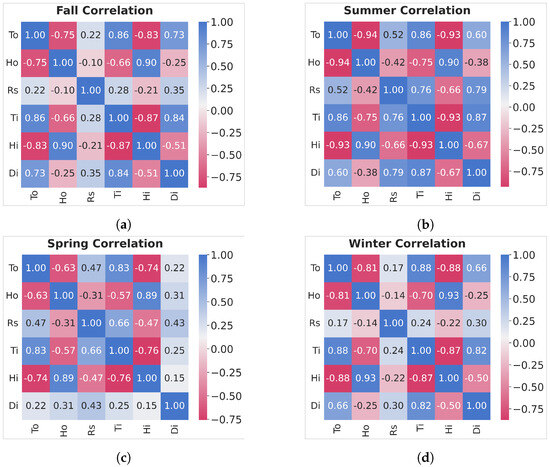 Correlation maps for each year’s season. Fall (a), summer (b), spring (c), and winter (d).