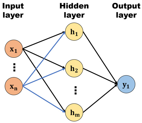 An ANN is a computing system inspired by biological neural processing research. The model consists of interconnected processing nodes, or neurons, that work together to solve complex problems. During training, the connections between nodes have their weights adjusted. A typical ANN, called a multiple-layer perceptron network, includes three layers: input, hidden, and output [47]. This is illustrated in Figure 3, and the formulas for these layers are expressed in Equations (2) and (3).