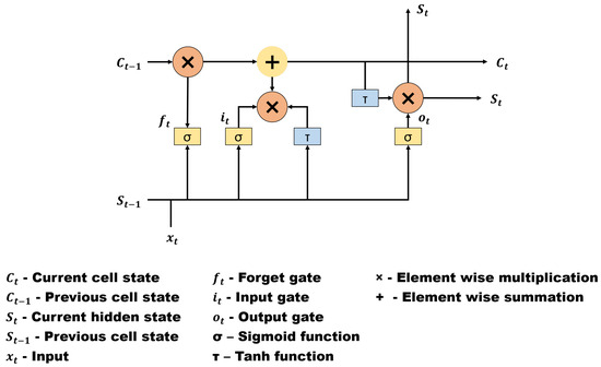 RNNs have different aspects, with LSTM being the most commonly used for time series forecasting. LSTM includes memory cells with three types of gates: input, output, and forget gates. The input gate regulates the flow into the memory cell of input activations, while the output gate regulates the yield flow to the rest of the network of cell activations. The forget gate scales the cell’s inner state before adding it to the cell as input through the cell’s self-recurring association, thus forgetting or resetting the cell’s memory adaptively. The memory cell is the key to the LSTM framework, as it goes directly down the entire chain with the capacity to add or extract cell state information, tightly controlled by structures called gates. These gates are optional data inlet ways consisting of a neural net layer sigmoid and point-sensitive multiplication [47], as shown in Figure 5.